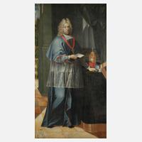überlebensgroßes Ganzfigurenbildnis eines würdevollen Geistlichen mit grauer Perücke in Amtstracht, am Tisch mit Uhr im Interieur, hierbei handelt es sich wohl um den kaiserlichen Hofrat Wilhelm Franz von Nesselrode-Ehreshoven (1638–1732, Sohn des Kurmainzischen Geheimrats, Kanzlers und Erbmarschalls des Herzogtums Berg, Bertram von Nesselrode und der Gräfin Maria Magdalena von Hatzfeld und Bruder des Johann Carl Goswin Freiherr von Nesselrode), der Dargestellte hatte zahlreiche geistliche wie weltliche Ämter inne, so war er Bischof in Fünfkirchen und Domherr in Münster, Paderborn und Lüttich, darüber hinaus fungierte er als pfalz-neuburgischer Gesandter in Osnabrück, Hofrichter, Oberjägermeister und Kaiserlicher Gesandter in Wien und am Savoyischen Hof, 1721 wurde er in den Reichsgrafenstand erhoben, links unten in Camaieutechnik gemaltes Wappen des Dargestellten, unter Verwendung des Wappens der Grafen von Nesselrode-Ehreshoven, gekrönt von einem Bischofshut, gering pastose Malerei, Öl über rotem Bolus auf Leinwand, 1. Hälfte 18. Jh., unsigniert, Craquelure, Keilrahmen etwas durchzeichnend, originale Naht der Leinwand sichtbar, kleine Fehlstellen in Leinwand und Malschicht, etwas restaurierungsbedürftig, Provenienz: süddeutscher Adelsbesitz, original gerahmt, Falzmaße ca. 246 x 141 cm.