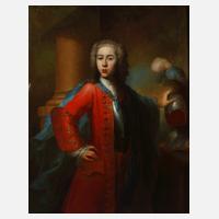 Dreiviertelbildnis eines herrschaftlichen jungen Mannes im Habit à la française mit grauer Allongeperücke, Brustharnisch unter edel besticktem roten Justaucorps, mit blauem Mantel, im Interieur mit Säule und Stoffdraperie, während der Dargestellte offenen Blicks zum Betrachter schaut und seine rechte Hand selbstbewusst auf die Hüfte stützt, greift er mit der Linken zum Helm mit prächtiger Federzier, auf einem Postament im Hintergrund, fein erfasstes absolutistisches Herrscherportrait in effektvoller Farbigkeit, Öl auf Leinwand, um 1720, unsigniert, rückseitig auf der Sperrholzplatte wohl von der Leinwandrückseite übertragener Schriftzug "Mar: Juli: Frank: Meth: Filius etc. etc.", Craquelure, auf Sperrholzplatte aufgezogen, restauriert, Kratzer, restaurierungsbedürftig, Provenienz: süddeutscher Adelsbesitz, alt gerahmt, Falzmaße ca. 116 x 91 cm.