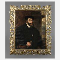 1548 schuf Lambert Sustris (1515–1591) sein berühmtes, ehemals Tizian zugeschriebenes Portrait des in einem Thronsessel in einer Loggia sitzenden Kaisers des Heiligen Römischen Reiches, Karl V. (1500–1558), das 205 x 122 messende Original befindet sich heute in der Alten Pinakothek München, vorliegend eine ausschnitthafte Wiedergabe des Gemäldes, es zeigt den Herrscher in dezenter schwarzer Kleidung mit schwarzem Barett im Halbprofil, einen Handschuh in der rechten Hand haltend, Karl V. verstand sich selbst als frommer Christ und Verteidiger der katholischen Kirche gegen die Reformation, so trägt der Habsburger Herrscher auf Lambert Sustris Portrait als einzigen Schmuck den Orden vom Goldenen Vlies, dessen Ordenssouverän Karl V. war, der Orden war Verfechter des unbefleckten Rittertums sowie der Erhaltung des katholischen Glaubens und der katholischen Kirche gewidmet, gering pastose Malerei, Öl auf Leinwand, wohl 18. Jh., unsigniert, feine Craquelure, alt geschlossene Fehlstelle in der Leinwand, gering restauriert, reinigungsbedürftig, in goldbronziertem Florentiner Rahmen der 2. Hälfte 19. Jh. gerahmt, Falzmaße ca. 92,5 x 73 cm.