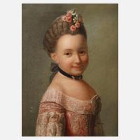 Brustbildnis eines kleinen Mädchens im rosa spitzenbesetzten Kleid, mit keckem Kropfband und Perücke mit kunstvoll eingeflochtenen Blumen, im Halbprofil vor lichtgrauem Grund, Louise Charlotte von Mecklenburg (1779 Schwerin bis 1801 Gotha) war die älteste Tochter des Großherzogs Friedrich Franz I. von Mecklenburg-Schwerin, sie heiratete 1797 den Erbherzog August von Sachsen-Gotha-Altenburg, fein lasierende Portraitmalerei, Öl auf Leinwand, 2. Hälfte 18. Jh., unsigniert, rückseitig auf dem Rahmen alt in dt. Kurrentschrift, teils unleserlich bezeichnet "Prinzessin von Mecklenburg (Luise) ver. ... Gotha" sowie neueres Etikett auf dem Keilrahmen "... 13 Familienbild Prinzessin v. Mecklenburg 55.45". Craquelure, alt doubliert, Pendant zur nachfolgenden Position, original gerahmt, Falzmaße ca. 46 x 36 cm.