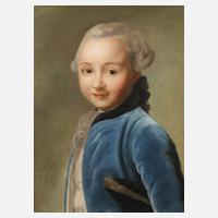 Brustbildnis eines kleinen Jungen mit grauer Perücke, im blauen Justaucorps und Chapeau bas getragenem Dreispitz, im Halbprofil vor lichtgrauem Grund, Friedrich Franz I. von Mecklenburg-Schwerin (1756 Schwerin bis 1837 Ludwigslust) Sohn des Erbprinzen Ludwig zu Mecklenburg (1725–1778) und der Charlotte Sophie von Sachsen-Coburg-Saalfeld (1731–1810) war ab 1785 regierender Herzog von Mecklenburg und ab 1815 Großherzog von Mecklenburg-Schwerin, er war der Vater der Louise Charlotte von Mecklenburg (1779 Schwerin bis 1801 Gotha), fein lasierende Portraitmalerei, Öl auf Leinwand, 2. Hälfte 18. Jh., unsigniert, rückseitig auf dem Rahmen alt in dt. Kurrentschrift teils unleserlich bezeichnet "4 Friedrich Franz I. als Kind" sowie neueres Etikett auf dem Keilrahmen "Nr. 14 Familienbild Prinz v. Mecklenburg 45 ...". Craquelure, alt doubliert, Pendant zur vorhergehenden Position, original gerahmt, Falzmaße ca. 45,5 x 36 cm.