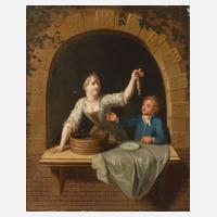 junge Frau mit ihrem Sohn, beim Verkauf von Fisch aus einem Fensterbogen, Genremalerei mit schöner Behandlung des Lichts, Öl auf Leinwand und doubliert, 18. Jh., leichtes Craquelure, minimale Kratzspuren, ungerahmt, Maße ca. 48,5 x 39,5 cm.