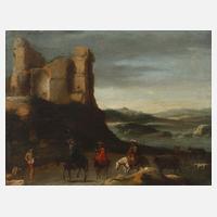 bukolische Szene mit Hirten und seiner Herde am Fuße einer ruinösen Burg, auf hohem Berg am Flussufer und drei Reitern auf der Landstraße, gering pastose barocke Genremalerei, Öl auf Leinwand, wohl um 1700, unsigniert, rückseitig altes, undeutlich lesbares Etikett "H...", Craquelure, restauriert, im schönen Goldstuckrahmen gerahmt, Falzmaße ca. 31 x 40,5 cm.