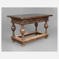 17./19. Jh., unter Verwendung alter Teile später umgebautes Möbel, vermutlich Unterteil eines Stollenschranks, Eiche massiv, dunkelbraun gebeizt, Zarge mit zwei Schubkästen, flankiert von zwei geschnitzten Löwenköpfen, Platte mit späterem Lack, stärkere Alters- und Gebrauchsspuren, Maße 81 x 129 x 76 cm.