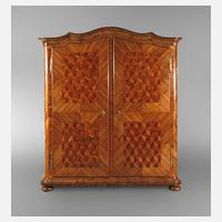 2. Hälfte 18. Jh., Nussbaum auf Nadelholz furniert, zweitüriger, zerlegbarer Schrank mit abgerundeten Ecken und geschweiftem Profilgesims, die Tür mit feiner Würfelmarketerie in Nussbaum, Eibe und Mahagoni verziert, Schlüsselbeschläge graviert und vergoldet, originales Schloss und Schlüssel, innen drei große feststehende Regalböden, restauriert, Maße 223 x 196 x 70 cm.