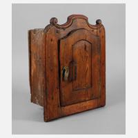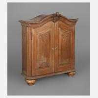 2. Hälfte 18. Jh., Eiche massiv, zweitüriger, flacher Korpus, Türen und Seiten mit geschnitzten Füllungen, geschwungenes Profilgesims, mit Weinrebe verziert, Füße später ergänzt, starke Altersspuren, restaurierungsbedürftig, Maße 132 x 120 x 38 cm.
