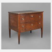 Eiche massiv, um 1780, zweischübiger Korpus mit leicht vorgebautem Mittelteil, auf kannelierten Spitzfüßen, originale Messingbeschläge, unrestaurierter Originalzustand mit stärkeren Gebrauchsspuren, Maße 81 x 88 x 60 cm.
