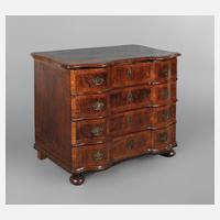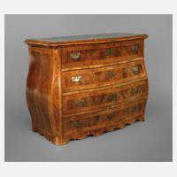 um 1750, Nussbaum und Nussbaummaser auf Nadelholz furniert, hoher, vierschübiger Korpus, dreiseitig bombiert, die Rechteckfelder aus Nussbaumwurzel, gerahmt von breiter Fadeneinlage, leicht geschweifte Platte mit breiter, in Kirschbaum furnierter Profilleiste, originale Beschläge und Schlösser, ein Schloss fehlt, alt restauriert, Maße 105 x 135 x 67 cm.