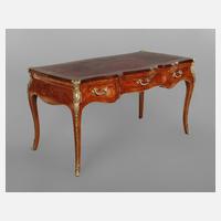 wohl Frankreich, um 1900, Rosenholz auf Nadelholz furniert, im Louis Quinze-Stil, das Blindholz der Schübe aus Eiche, frei im Raum stellbares Schreibmöbel, allseitig bombiert und mit floralen Intarsien verziert, dekorative Bronzebeschläge komplett erhalten, Arbeitsplatte mit originalem goldgeprägten Ledereinsatz, dieser mit Alters- und Gebrauchsspuren, Oberfläche restauriert, mit Schlüssel, Maße 80 x 159 x 77 cm. Provenienz: lt. Angaben des Einlieferers stammt das Objekt aus dem Hofmobiliendepot, welches dem Land Salzburg zugewiesen wurde, und stand dort im Amtszimmer des Bürgermeisters.