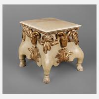 2. Hälfte 18. Jh., Holz geschnitzt, kreidegrundiert, cremefarben gefasst und vergoldet, auf drei Seiten verziert mit geschnitzten Widderköpfen, Festons und Akanthusblättern, die Wandung stark bombiert, die Füße als Bocksbeine gearbeitet, Marmorplatte ergänzt, Alters- und Gebrauchsspuren, rest.bed., Maße 59 x 57 x 60 cm.