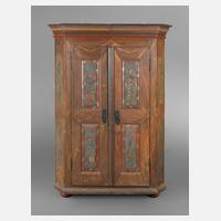 datiert 1789, kleiner zweitüriger Schrank mit abgeschrägten Ecken, Türen mit reliefierten Kassettenfüllungen, originale Farbfassung, innen spätere Regaleinteilung, stärkere Alters- und Gebrauchsspuren, Schlüssel fehlt, rest.bed., Maße 173 x 137 x 60 cm.