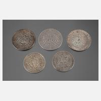 1 Vereinsthaler Preußen 1871, Wilhelm I. ss+, geputzt; 1 Vereinsthaler Preußen 1860, Friedrich Wilhelm IV. ss+; 5 Mark Sachsen 1907, Friedrich August ss+; 5 Mark Sachsen 1900, Albert ss; 5 Mark Sachsen 1876, Albert vz, geputzt.