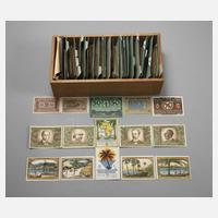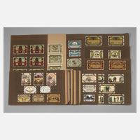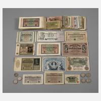 ca. 30 Stück, vorwiegend Städte- und Notgeld aus der Inflationszeit, darunter 1000 Mark Pforzheim; 2 Millionen Mark Göppingen; 500.000-, 50 Milliarden- und eine Billion Mark Esslingen sowie Verrechnungsscheine über 10- und 50 Mark der Wehrmacht, guter Zustand.