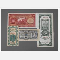 One Dollar Britisch Malaysia um 1930; Ten Yuan 1935; 20 Yuan 1935 und Wertschein über 5 Yuan um 1930, alle bankfrisch.