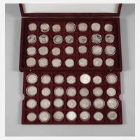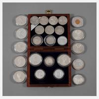 25 Stück, darunter Royal-Wedding-Serie in 925 Silber von 1981 mit One Dollar Bermuda; One Crown Gibraltar; Ten Dollars Jamaica; Two Pounds Jersey; Ten Dollars Bahamas; 25 Pence Guernsey und One Crown Isle Of Man, G je ca. 28 Gramm; dazu siebenmal 10 DM BRD; zweimal 10 Rubel Olympiade Moskau 1979 (Silber 900, G ca. 34 g); sowie neun Medaillen (Silber 999, G ca. 90 g); zwei Medaillen (Silber geprüft, Legierung nicht bestimmbar, G ca. 24 g) und ein Half Dollar George Washington 1982.