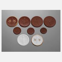sieben Stück Böttgersteinzeug, dabei viermal 10 Mark 1921, "Tönendes Erz Liebe beschert´s (davon zweimal in Porzellan); 10 Mark Jägerbataillon 12; 2 Mark 1922, Dresdner Bank; 1, 2 und 3 Mark 1921, Lengefeld im Erzgebirge, guter Zustand.