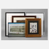 neuzeitlich, Holz und Metall, teilweise hinter Glas gerahmt, teils farbig lackiert bzw. goldbronziert, beigegeben verschiedene Grafiken, gute Zustände mit geringen Altersspuren, H max. 53 cm.