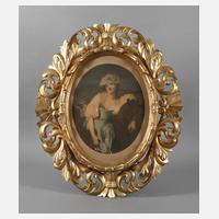 1. Hälfte 19. Jh., schlichter, ca. 8 cm breiter goldbronzierter, gekehlter Rahmen mit gestuckten Floralismen, Bändern und Putten in den Eckbereichen, Nadelholz, Ecken rechtwinklig verzapft, außen braun gefasst, kleinere restaurierte Fehlstellen, Falzmaße 52 x 43 cm.