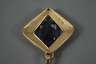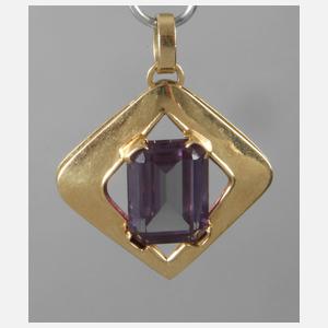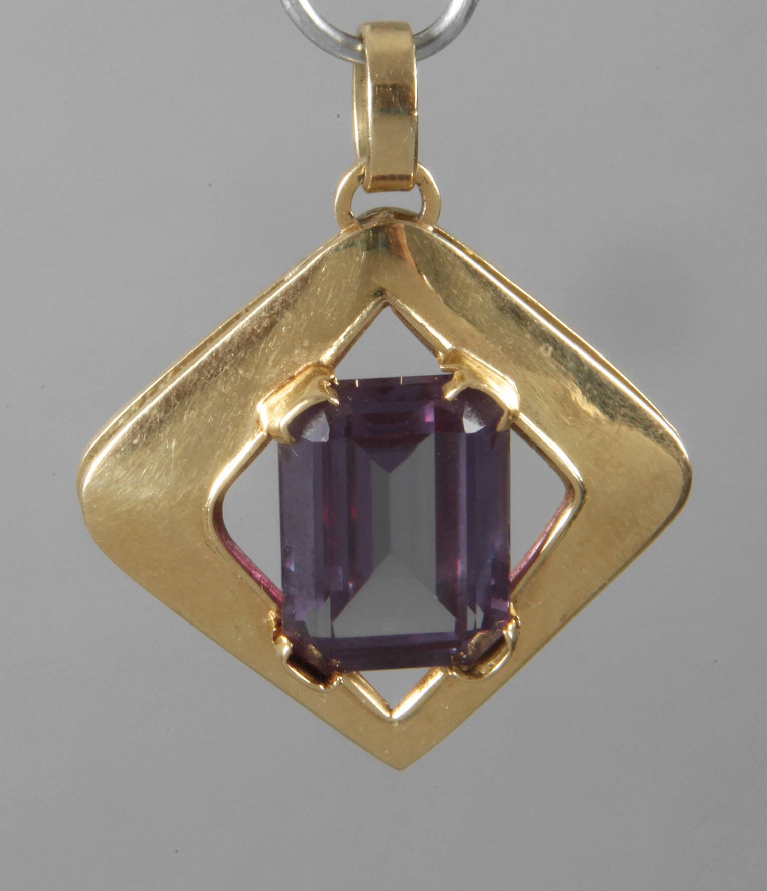 um 1980, Gelbgold gestempelt 585, mittig besetzt mit einem facettierten synthetischen Alexandrit, Maße Anhänger 45 x 35 mm, G ca. 10 g.