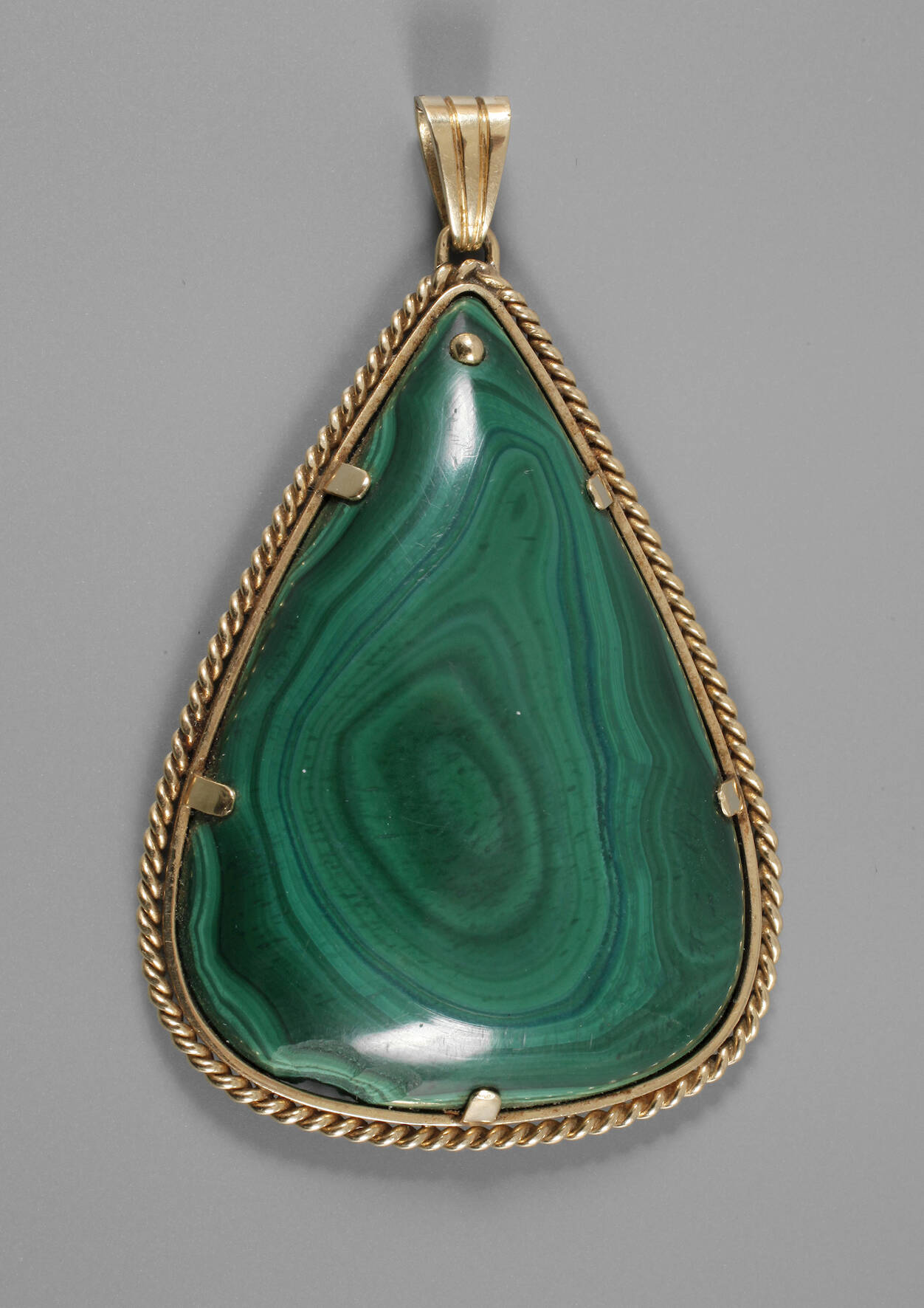 um 1970, Gelbgold gestempelt 585, besetzt mit einem schön gemaserten Malachit-Cabochon, umgeben von korrodiertem Draht, minimale Tragespuren, Maße 68 x 42 mm, G ca. 44,1 g.