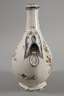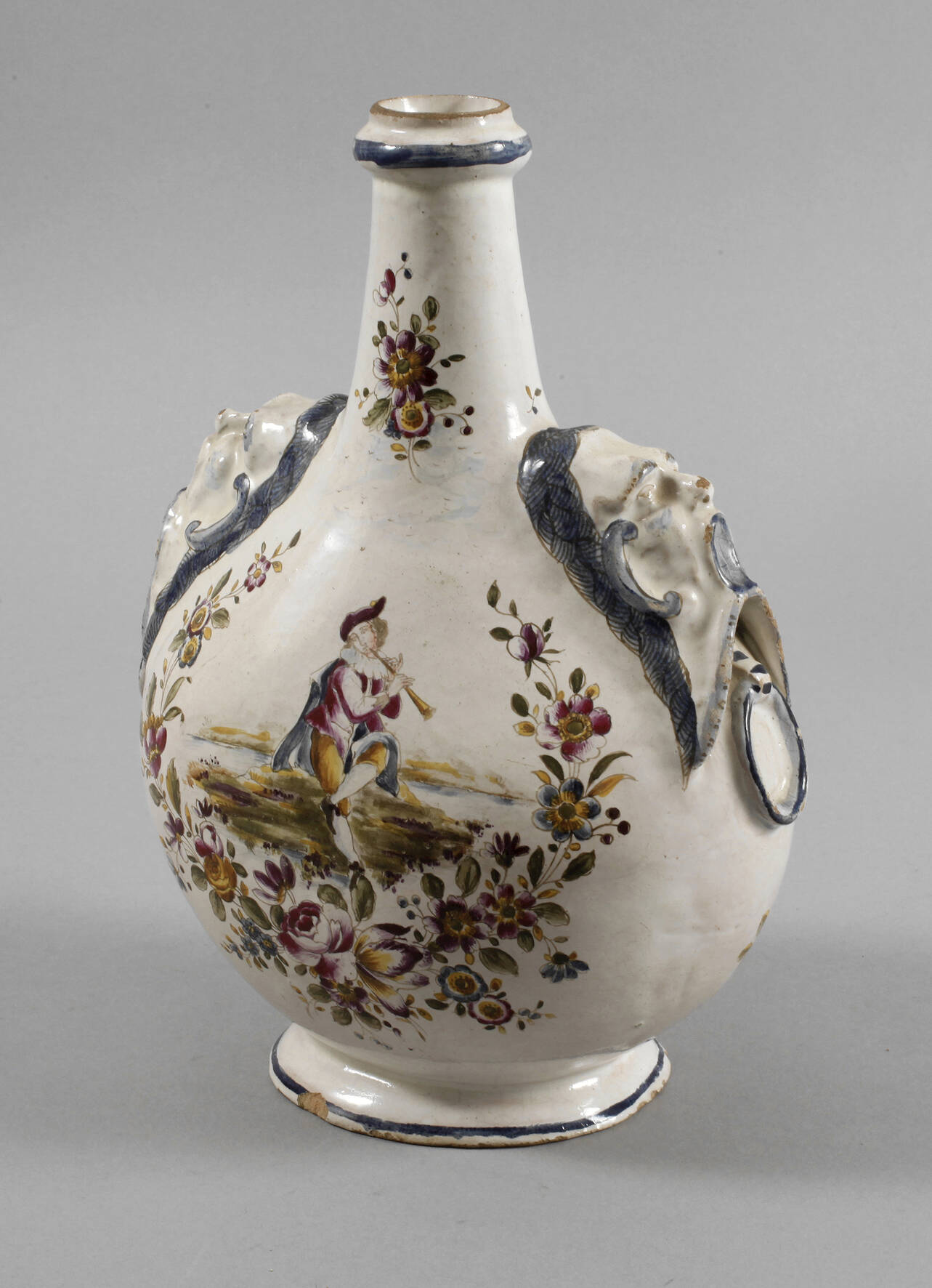 Italien, Mitte 18. Jh., hellgrauer Fayencescherben weißlich glasiert, beidseitig mit polychromer Blumenmalerei verziert, frontseitig flötespielender Jüngling, die Schulter mit zwei großen, hohl aufgelegten Maskaronen, zwei Chips am Standring, sonst guter altersgemäßer Zustand, H 31 cm.