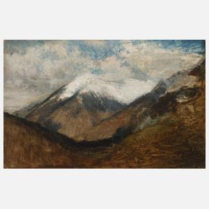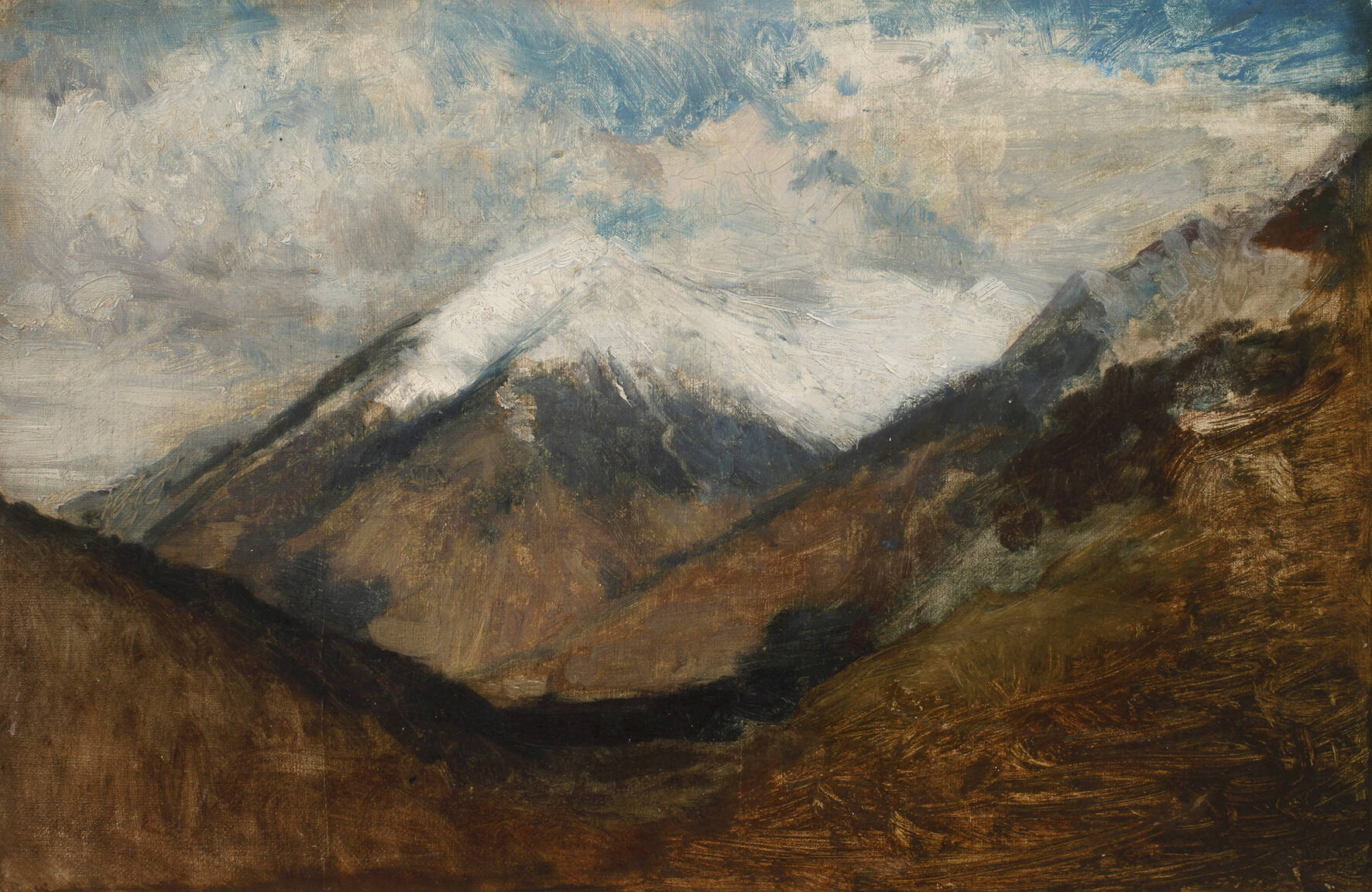 Studie mit dem teils von Wolken verhüllten Niesen im Berner Oberland, flotte, teils nur angelegte Landschaftsmalerei mit partiell leicht pastosem Farbauftrag, Öl auf Leinwand und auf Pappe kaschiert, Ende 19. Jh., rückseitig Kopie mit Abbildung vom Niesen und Vermerk, dass es sich um eine Arbeit von Willibald Wex handeln soll, leicht farbschwundrissig, ungerahmt, Maße ca. 26,5 x 40 cm.