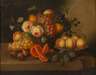 üppiges Arrangement aus verschieden Früchten und Blumen, drapiert auf einer Tischplatte, teils lasierende Stilllebenmalerei in fein abgestimmter Farbigkeit, Öl auf Leinwand, Ende 19. Jh., leichtes Craquelure, wenige winzige Verluste in der Malschicht, im ca. 10 cm breiten, gestuckten und goldbronzierten Rahmen, Falzmaße ca. 42,5 x 53,5 cm.