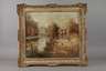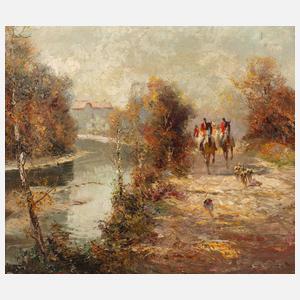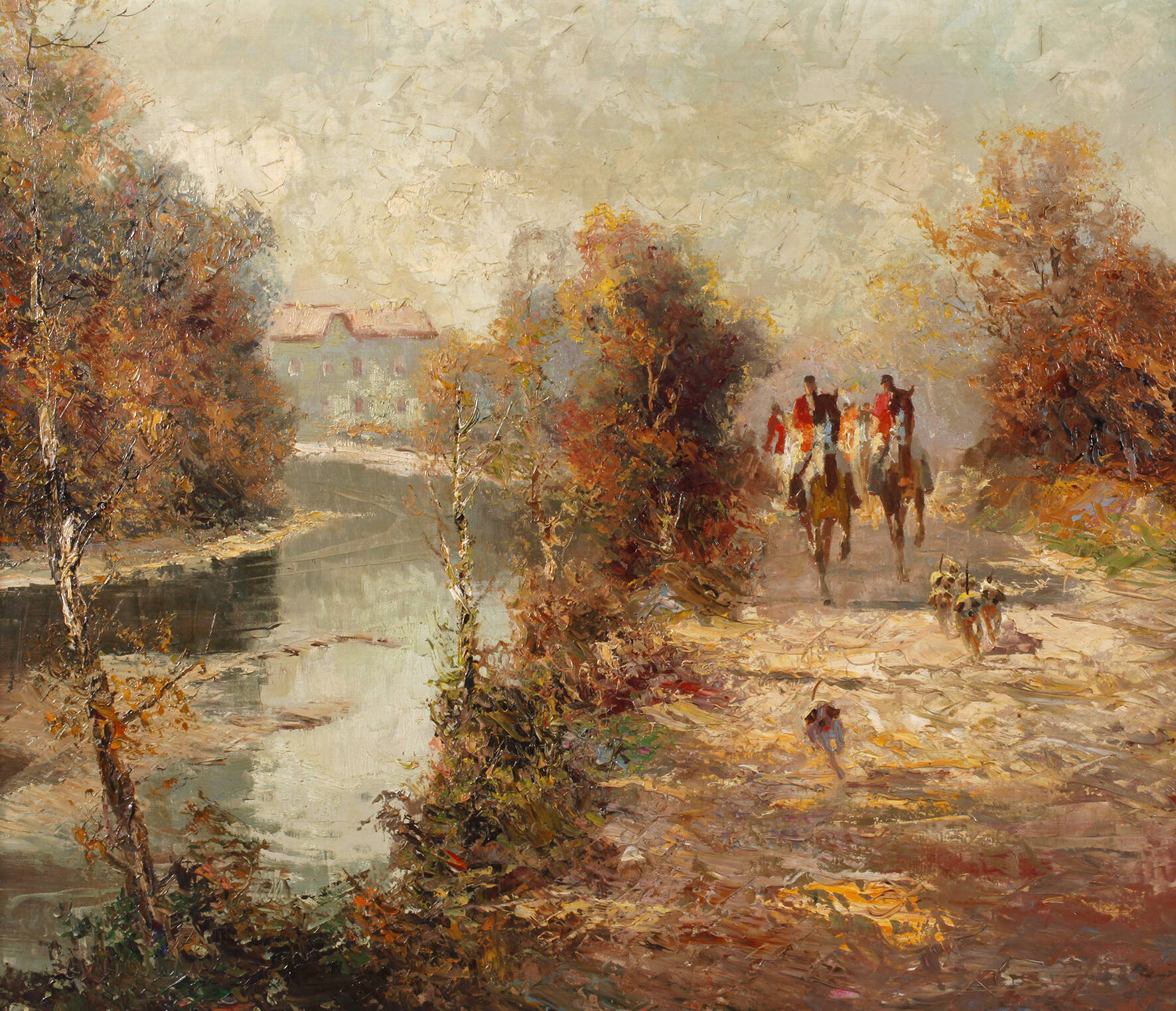 den Betrachter entgegenkommende, von Reitern begleitete Meute von Hunden in herbstlicher Landschaft, pastose Jagdmalerei in warmer, freundlicher Farbigkeit, Öl auf Leinwand, um 1980, links unten Ritzsignatur, "Gschosmann", rückseitig bezeichnet "Gschossmann", in Prunkrahmen (mit geringen Erhaltungsmängeln), Falzmaße ca. 61 x 71 cm. Künstlerinfo: auch Gschossmann, dt. Landschafts- und Freskomaler, Zeichner und Bühnenbildner (1894 Straßburg bis 1988 Tegernsee b. München), Schüler der Kunstschule Hamburg, stud. an einer Freskoschule und der Kunstgewerbeschule München, besuchte Abendkurse an der Münchner Akad. bei Prof. Bauer und Lehrgänge zum Bühnenbildner in Augsburg und Lübeck, zunächst realistischer Landschaftsmaler, später zunehmend Impressionist, beschickte Ausstellungen in Deutschland, Frankreich, Schweden, der Schweiz und den USA , tätig in Straßburg und München, Quelle: Bénézit, Bruckmann und Internet.