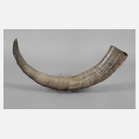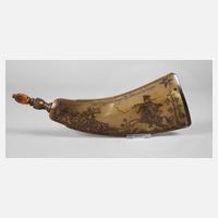 19. Jh., Horn mehrteilig gearbeitet und montiert, teils gedrechselt, aufwendig graviert, mit Umschrift „Nach Jagen und Fangen ist stets mein Verlangen, sowie Des edlen Hirsches größte Freud ist nur recht um Egidi Zeit“, Altersspuren, L 30 cm.