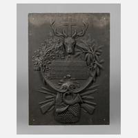 datiert 1913, verziert mit Hubertushirsch, Eichenlaub und Tannenzweigen sowie Jagdtasche, Gewehren und Jagdhorn, mittig Sinnspruch, Korrosionsspuren, Maße 86 x 63 cm.