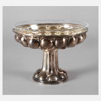 um 1900, Silber gestempelt Halbmond, Krone, 800, Herstellermarke Wilhelm Binder/Schwäbisch Gmünd, Vertriebsstempel E. Goldschmidt, kleiner runder Tafelaufsatz mit godronierter Wandung mit Buckeln und dazwischenliegenden Kämmen, unter dem umgebördelten Rand Akanthusreliefs im Rapport, facettierter Schaft und ausschwingender Stand, dieser ebenfalls mit Buckeln und Kämmen verziert, originaler Glaseinsatz aus formgeblasenem Klarglas mit umlaufend geschliffenem Zähnchenrand, dieser bestoßen, Alters- und Gebrauchsspuren, H ca. 12,5 cm, D ca. 16,5 cm, G ca. 187 g.