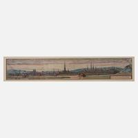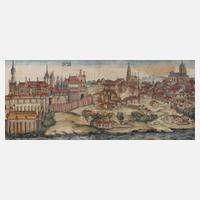 Blick aus der leichten Vogelschau auf die Stadt an der Donau, mit dem Schlosskomplex auf der linken Bildhälfte, im Bereich des Himmels bezeichnet "Buja", aus der Schedelschen Weltchronik, aquarellierter Holzschnitt, erste Auflage erschien 1493, mittig übliche Faltlinie, im Bereich des Himmels fleckig, Blattrand partiell mit Deckweiß überarbeitet, unter Passepartout und hinter Glas gerahmt, Darstellungsmaße ca. 24 x 53 cm. Künstlerinfo: dt. Arzt, Humanist und Historiker (1440 Nürnberg bis 1514 ebenda), stammte aus den sogenannten Ehrbaren Familien von Nürnberg, 1456, bereits mit 16 Jahren, Studium an der Universität Leipzig, 1461 schloss er sich dem humanistischen Kreis um Peter Luder an, 1463 Reise nach Padua, und hier Studium der Medizin, Chirurgie und Anatomie an der Universität, 1466 Rückkehr nach Nürnberg, 1470–77 Stadtarzt von Nördlingen, ab 1477 Stadtarzt von Amberg, ab 1482 als Arzt wieder in Nürnberg ansässig, 1493 Herausgabe der Schedelschen Weltchronik, Quelle: Wikipedia.