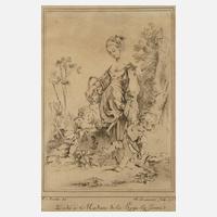 junge Frau, umringt von drei kleinen Kindern, in der Natur, unter der Darstellung betitelt "Dédié a Madame de la haye la Jeune", Grayonmanier, rechts unten bezeichnet und datiert "B. Dazaincourt Sculp. 1758" sowie links bezeichnet "F. Boucher del." (Francois Boucher), Papier leicht gebräunt, unter Passepartout und hinter Glas gerahmt, Darstellungsmaße ohne Schrift ca. 18,3 x 14,5 cm. Künstlerinfo: frz. Kupferstecher (1719-1794), Quelle: Internet.