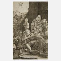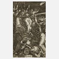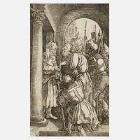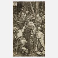 seitenverkehrte Kopie, Blatt aus der Kupferstichpassion, Kupferstich auf schwachen Bütten, in der Platte bezeichnet "AD 1512", umlaufender Papierrand, Papier leicht gegilbt und etwas fleckig, Darstellungsmaße ca. 11,6 x 7,4 cm, Blattmaße 13,5 x 9 cm.