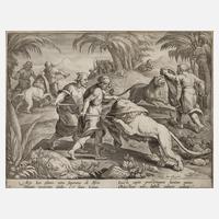 hügelige Landschaft mit Palmen, darin Männer bei der Löwenjagd, unter der Darstellung in der Platte lateinischer Text, Kupferstich, Anfang 17. Jh., in der Darstellung auf dem Stein bezeichnet "Ioan. Stradanus inuicent, Corn. Galle sculp.", im rechten unteren Bereich bezeichnet "Ioan Galle exud.", etwas faltig und Einrisse, unter Passepartout und hinter Glas gerahmt, Darstellungsmaße ohne Schrift ca. 18,8 x 26 cm. Künstlerinfo: niederl. Zeichner und Kupferstecher (1576 Antwerpen bis 1650 Antwerpen), stammte aus einer Kupferstecherfamilie, Sohn des Philipp Galle, erlangte durch seine Stiche nach Peter Paul Rubens Bekanntheit, Reise nach Rom, Quelle: Thieme-Becker und Wikipedia.