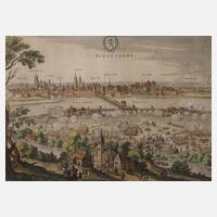 Darstellung der Belagerung von Ingolstadt durch die Schweden im Jahr 1632, im Bereich des Himmels mittig unter dem Wappen bezeichnet "Ingolstadt", aus "Theatrum Europaeum", aquarellierter Kupferstich, zwei kaum sichtbare Faltlinien, leichte Altersspuren, unter Passepartout und hinter Glas gerahmt, Darstellungsmaße ca. 22,5 x 32 cm. Künstlerinfo: schweiz. Kupferstecher, Buchhändler und Verleger (1593 Basel bis 1650 Schwalbach), 1606–09 Schüler des Kupferstechers Dietrich Meyer und des Glasmalers Christof Murer in Zürich, 1610 bei Friedrich Brentel in Straßburg, 1625 Übernahme der Kunsthandlung seines Schwiegervaters Johann Theodor de Bry in Frankfurt am Main, nach seinem Tod führten seine Söhne Matthäus der Jüngere und Caspar sowie später deren Nachkommen den Verlag unter der Bezeichnung ”Merians Erben” bis 1727 weiter und vervollständigten seine Hauptwerke ”Topographia Germaniae” und ”Theatrum Europaeum”, Quelle: Thieme-Becker und Internet.