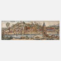 Blick über die Donau auf Ulm, mit dem Münster und seinen Befestigungsanlagen, im Bereich des Himmels bezeichnet "Ulma", aus der Schedelschen Weltchronik, aquarellierter Holzschnitt, erste Auflage erschienen 1493, mittig stärker sichtbare Faltlinie, etwas fleckig, unter Passepartout (wasserrandig) und hinter Glas gerahmt, Passepartoutausschnitt ca. 19 x 51 cm. Künstlerinfo: dt. Arzt, Humanist und Historiker (1440 Nürnberg bis 1514 ebenda), stammte aus den sogenannten Ehrbaren Familien von Nürnberg, 1456, bereits mit 16 Jahren, Studium an der Universität Leipzig, 1461 schloss er sich dem humanistischen Kreis um Peter Luder an, 1463 Reise nach Padua, und hier Studium der Medizin, Chirurgie und Anatomie an der Universität, 1466 Rückkehr nach Nürnberg, 1470–77 Stadtarzt von Nördlingen, ab 1477 Stadtarzt von Amberg, ab 1482 als Arzt wieder in Nürnberg ansässig, 1493 Herausgabe der Schedelschen Weltchronik, Quelle: Wikipedia.