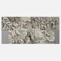 fünf Blatt mit mythologischen Themen, wohl aus der Folge Odyssee, ein Blatt unter der Darstellung mit lateinischem Text, in der Darstellung nummeriert 6, 7, 8, 9 und 10, Kupferstiche, um 1630-35, wohl etwas spätere Abzüge, jeweils in der Darstellung monogrammiert "TvT", ein Blatt zusätzlich mit Nummer "11" in Tusche versehen, rückseitig Spuren alter Montierung, minimale Erhaltungsmängel, Darstellungsmaße max. ca. 19,5 x 32,5 cm. Künstlerinfo: auch Tulden, niederländischer Maler, Zeichner und Kupferstecher (1606 Herzogenbusch bis 1669 ebenda), ab 1621 Schüler von Abraham Blyenburch, nachfolgend Schüler von Peter Paul Rubens, ab 1626 Freimeister der Lukasgilde, deren Vorsteher er 1638-39 war, 1631/33 in Paris nachweisbar, 1635 heiratet er das Patenkind von Peter Paul Rubens, die Tochter des Malers Hendrik van Balden, ab 1635 übernimmt er im Auftrag von Antwerpen die Herausgabe des 43 Tafeln umfassenden Prachtbands zur Erinnerung an die von Peter Paul Rubens entworfene Festdekoration zum Einzug des Stadthalters Kardinal Ferdinand, 1636 wird er Bürger von Antwerpen, von 1643 bis zu seinem Tod wieder in seiner Geburtsstadt ansässig, Quellen: Thieme-Becker und Internet.