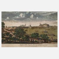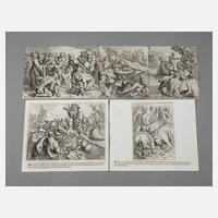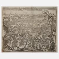 vielfigürliche Szene der "Glorreichen Revolution [Glorious Revolution]" aus dem Jahre 1688, der protestantische, dem Haus Oranien-Nassau entstammende, Prinz Wilhelm III. (1650-1702) residierte als Statthalter der Niederlande, er war der Neffe des regierenden Königs von England Karl II., als dieser 1685 kinderlos starb, folgte dessen Bruder Jacob II. auf den Thron, Wilhelm III. war mit Jacobs Tochter Maria II. verheiratet, nachdem sein Schwiegervater Jacob II. zum Katholizismus übergetreten war und zunehmend den Einfluss der protestantischen Kirche zurückdrängte, wandte sich das englische Parlament hilfesuchend an Wilhelm von Oranien, Wilhelm entmachtete daraufhin zum Jahresende 1688, nach einer militärischen Intervention, seinen Schwiegervater und zog als Sieger in London ein, die aus der Vogelschau aufgenommene Szene zeigt die Ankunft der Wagenkolonne Wilhelms, rechts im Vordergrund feiernde Menschen und Salut schießende Soldaten vor der Kulisse von London mit der Themse, großformatige Radierung auf Bütten, aus dem von Matthäus Merian begründeten Geschichtswerk "Theatrum Europaeum", um 1690, unsigniert, über der Darstellung Schriftband "Einzug Wilhelmi Henrici Prinzen von Orange zukunfftigen Königs in England etc.: in London", Blattränder außerhalb der Darstellung partiell restauriert, geringe Altersspuren, im Passepartout, ungerahmt, Plattenmaß ca. 30 x 36 cm.