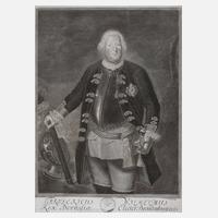 Bildnis Friedrich Wilhelm von Preußen (1688–1740), genannt der Soldatenkönig, im Alter von 44 Jahren, mit dem Bruststern des Schwarzen Adlerordens, nach einem Gemälde von Anton Pesne, unter der Darstellung betitelt "Friderircus Wilhelmus Rex Borussia Elector Brandenburgensis", Kupferstich, unter der Darstellung rechts bezeichnet und datiert "J. G. Wolfgang S. R. fe- et ex. 1732 C. Pr: Reg." und links "Ant. Pesne P. R. pinxit.", leichte Altersspuren, kleine Retusche, Darstellungsmaße ohne Schrift ca. 35 x 27,5 cm, Blattmaße ca. 38,5 x 28 cm. Künstlerinfo von Johann Georg Wolfgang, dt. Kupferstecher (1662 oder 1664 Augsburg bis 1744 Berlin), Sohn des Kupferstechers Georg Andreas Wolfgang, Lehre bei seinem Vater, ab 1684 weitere Ausbildung in Amsterdam, bei Rückkehr von einer Reise nach England Festnahme durch algerische Korsaren und Verschleppung als Sklave nach Algerien, 1688, nach Zahlung eines Lösegelds, Freilassung und Rückkehr nach Augsburg, 1704 Ernennung zum königlichen Hofkupferstecher, ab 1706 Ehrenmitglied der Akademie der Künste und Wissenschaften in Berlin, Quelle: Thieme-Becker, Nagler und Wikipedia.