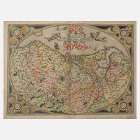 im oberen Bereich von Engeln gehaltene Kartusche und hierin beschriftet "Descriptio Germaniae Inferioris.", ovaler Bildausschnitt mit der Darstellung des Gebietes zwischen der Nordsee im Norden, Emden im Osten, Köln im Süden und Paris im Westen, kolorierter Kupferstich, um 1570, wohl etwas späterer Druck, rückseitig typographischer Text, mittig Faltlinie, geringe Altersspuren, an der unteren Blattkante Notate in Bleistift, Darstellungsmaße ca. 37,5 x 50,5 cm, Blattmaße ca. 41,5 x 55 cm. Künstlerinfo: flämischer Geograph und Kartograph (1527 Antwerpen bis 1598 ebenda), entstammt einer aus Augsburg in die Niederlande eingewanderten Familie Örtel (Oertel), gilt als der Begründer der modernen Kartographie, nach Mathematik-, Griechisch- und Lateinstudium in Antwerpen als Karten- und Buchhändler tätig, bildete sich zum Kartographen weiter, gab 1570 die erste Ausgabe seines später in 42 Ausgaben und 7 Sprachen erschienenen "Theatrum Orbis Terrarum" heraus, die die erste Sammlung von Landkarten in Buchform darstellt, Quelle: Thieme-Becker, Wikipedia und Internet.
