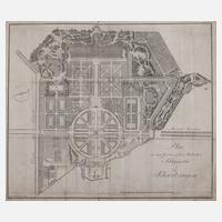 detaillierter Plan der barocken Gartenanlage in Baden-Württemberg, Kupferstich, 2. Hälfte 18. Jh., in den beiden unteren Ecken bezeichnet rechts "gest. v. F. Wolff zu Mannh." und links "Gezeich. v. Garten Director Leyher", Faltlinien und im Randbereich einige Einrisse, etwas angeschmutzt, Darstellungsmaße ca. 39 x 45 cm, Blattmaße ca. 41,5 x 47,5 cm.