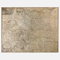 links oben prachtvolle Kartusche und hierin Widmung "Dem durchlauchtesten Fürsten und Herrn Herrn Carl Anselm des Heil. Römischen Reichs-Fürsten von Thurn und Taxis ...", rechts daneben Rokokokartusche und hierin bezeichnet "Nouvelle Carte Geographique des Postes D´Allemagne ... Heritiers de Homan a Nuremberg 1786", unten links weitere Kartusche und hier bezeichnet "Neue und vollständige Postkarte durch ganz Deutschland ... herausgegeben von denen Homaennischen Erben in Nürnberg, 1786" und hierunter Meilenmaß, rechts unten weitere Legende, Darstellung des Gebietes zwischen der Nordsee im Norden, Warschau im Osten, Turin im Süden und Paris im Westen, teilkolorierter Kupferstich auf zwei zusammengefügten Bögen Papier, eine Seite leicht gegilbt, hinter Glas gerahmt, Darstellungsmaße ca. 77 x 94 cm, Falzmaße ca. 80 x 97 cm. Info Info: Homanns Erben: Johann Baptist Homann (1664 Kambach bis 1724 Nürnberg, dt. Kupferstecher, Verleger und Jesuit) gründete um 1702 den eigenen Verlag "Homännisches Landkarten-Offizin", tätig unter anderem in Wien, Leipzig und Nürnberg, nach seinem Tod am 1. Juli 1724 ging sein Unternehmen auf seinen Sohn Dr. Johann Christoph Homann (1703−1730) über, der seine beiden Geschäftsführer Johann Georg Ebersberger (oder Ebersperger) und Johann Michael Franz zu Erben der Handlung einsetzte, nach seinem Tod 1730 wurde das Unternehmen unter dem Namen „Homannsche Erben“ (frz. Heritiers de Homann, lateinisch Homannianos Heredes) fortgeführt und erlosch erst 1848 mit dem Tod des letzten Besitzers Christoph Franz Fembo, Quelle: Thieme-Becker und Internet.