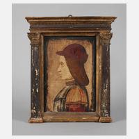 Brustbildnis eines jüngeren Mannes mit langem brünetten Haar und rotem Hut (Bycocket) im Profil, vor hellem Grund, fein mit spitzem Pinsel erfasste Malerei, Mischtechnik (Tempera und Tusche) auf kreidegrundierter Leinwand und Holzplatte, 15. Jh., unsigniert, rückseitig altes unleserliches Etikett des 19. Jh., laut Vorbesitzerinfo in Alencon erworben, alt retuschiert, Craquelure, verputzt, Malschichtverluste, Holzplatte sekundär dreiseitig angestückt und geschwärzt, im partiell vergoldeten Tabernakelrahmen (holzwurmstichig, restaurierungsbedürftig) des 16. Jh. gerahmt, Originalgröße der Malplatte ca. 21,5 x 13 cm, Falzmaße ca. 23,5 x 17 cm.