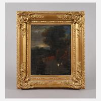 abendliche Szene in felsiger mediterraner Landschaft, mit weidenden Kühen und Ziege, neben schlummernden Hirten, fein lasierende, partiell unvollendete Malerei, Öl auf Holzplatte, unsigniert, rückseitig diverse, teils unleserliche Etiketten und Annotationen, unter anderem Etikett "The Boydell Galleries ... Liverpool" und ungeprüfte Zuschreibung "Nicolas Berchem", Craquelure, alt restauriert, partiell wohl sekundär ergänzt (z.B.: Hirte), im Spätbiedermeier-Goldstuckrahmen mit Rahmenschild "Nicolaes Berchem" gerahmt, Falzmaße ca. 32 x 26 cm. Künstlerinfo: eigentlich Nicolaes Pietersz Berchem, niederländischer Maler, Zeichner und Grafiker (1620 Haarlem bis 1683 Amsterdam), Lehre bei seinem Vater, dem Stilllebenmaler Pieter Claesz, nachfolgend vermutlich Schüler bei Jan van Goyen, Pieter de Grebber und Jan Wils, 1642 Eintritt in die Sankt-Lukasgilde zu Haarlem, nach 1646 auch als Lehrer tätig, unternahm vermutlich einige Italienreisen, vor 1660 kurzzeitig in Amsterdam ansässig, ließ sich 1677 endgültig in Amsterdam nieder, Berchem zählt zu den bekanntesten Vertretern der niederländischen Landschaftsmalerei des 17. Jh., Quelle: Thieme-Becker, AKL, Wikipedia und Internet.