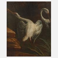 Darstellung zweier Löffelreiher am Seeufer, in dämmriger Landschaft, gering pastose barocke Tiermalerei, Öl auf Leinwand, 18. Jh., unsigniert, rückseitig appliziertes typographisches Etikett mit ungeprüfter Zuschreibung "Oudry, Jean Baptiste 1686-1755 Beauvais", Craquelure, wohl Fragment, alt doubliert und auf Keilrahmen des 19. Jh. aufgespannt, linke untere Ecke wohl ergänzt, Knickspuren, alt retuschiert, etwas restaurierungsbedürftig, ungerahmt, Maße ca. 48,5 x 40 cm. Künstlerinfo: frz. Maler, Zeichner, Radierer, Entwerfer, Illustrator und Patronenzeichner (1686 Paris bis 1755 Beauvais), Sohn und Schüler des Malers und Gemäldehändlers Jacques Oudry, weitergebildet bei Michel Serre und fünf Jahre Atelierschüler des Portraitmalers Nicolas de Largillière, 1708 Meister der St. Lukasgilde, 1714 Assistent und 1717 Professor an der Lukasakademie, 1717 Anwärter und 1719 Mitglied der Académie royale de peinture et de sculpture Paris, schlug 1818 ein Angebot Peter des Großen aus, ihn als Hofmaler nach St. Petersburg zu begleiten, 1724 Ernennung zum Hofmaler Ludwig XV. und königliche Wohnung im Louvre, ab 1725 künstlerischer Direktor und ab 1734 Leiter der Tapisseriemanufaktur in Beauvais/Hauts-de-France, welche unter seinem Vorsitz Weltruhm erlangte, ab 1736 zusätzlich Direktor der Pariser Gobelinmanufaktur, 1739 Assistent und 1743 Professor an der königlichen Akademie, beschickte den Pariser Salon, gefördert und gesammelt von Herzog Christian Ludwig II. von Mecklenburg-Schwerin, dem König von Dänemark und der schwedischen Königin, Quelle: Thieme-Becker, Saur "Bio-Bibliograpgisches Künstlerlexikon", Bénézit, Müller-Singer, Seubert, Müller-Klunzinger, Nagler und Wikipedia.