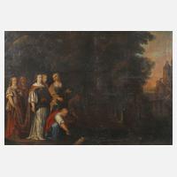 Darstellung der alttestamentarischen Szene der Auffindung des Moses, die Bibel berichtet davon, dass die Nachkommen Jakobs sich in Ägypten rege vermehrten, als ein neuer Pharao an die Macht kam, argwöhnte dieser, dass das Volk der Israeliten zu mächtig würde und Ägypten hieraus ein innerer Feind erwüchse, der Pharao ordnete daraufhin an, dass alle männlichen Neugeborenen umzubringen seien, in dieser Zeit gebar eine jüdische Frau einen schönen Sohn und nach drei Monaten, als sie ihn nicht mehr gefahrlos verbergen konnte, legte sie den Säugling in ein mit Teer abgedichtetes Binsenkästchen und setzte es am Nilufer aus und ließ es von der kleinen Schwester des Knaben bewachen, die folgende – auch im Gemälde dargestellte Begebenheit beschreibt das Buch Mose (2,5–10) wie folgt "... Die Tochter des Pharao kam herab, um im Nil zu baden. Ihre Dienerinnen gingen unterdessen am Nilufer auf und ab. Auf einmal sah sie im Schilf das Kästchen und ließ es durch ihre Magd holen. Als sie es öffnete und hineinsah, lag ein weinendes Kind darin. Sie hatte Mitleid mit ihm und sie sagte: Das ist ein Hebräerkind. Da sagte seine Schwester zur Tochter des Pharao: Soll ich zu den Hebräerinnen gehen und dir eine Amme rufen, damit sie dir das Kind stillt? Die Tochter des Pharao antwortete ihr: Ja, geh! Das Mädchen ging und rief die Mutter des Knaben herbei. Die Tochter des Pharao sagte zu ihr: Nimm das Kind mit und still es mir! Ich werde dich dafür entlohnen. Die Frau nahm das Kind zu sich und stillte es. Als der Knabe größer geworden war, brachte sie ihn der Tochter des Pharao. Diese nahm ihn als Sohn an, nannte ihn Mose und sagte: Ich habe ihn aus dem Wasser gezogen. ...", die dargestellte Szene wurde vom Künstler in eine europäische Phantasielandschaft eingebettet und auch die Pharaonentochter in ihrer kostbaren hermelinverbrämten Robe erinnert an europäische Herrscher des 17. Jh., pastose, religiöse, barocke Genremalerei, Öl auf Leinwand, um 1700, unsigniert, rückseitig gestempelt "Hagans Erfurt 3. Dez. 1954", Craquelure, Farbaufschüsselungen, hinterlegte Fehlstelle in der Leinwand, alt restauriert, restaurierungsbedürftig, in ca. 7 cm breiter Berliner Leiste gerahmt, Falzmaße ca. 73,5 x 103,5 cm.
