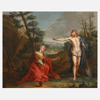 biblische Szene des Johannesevangeliums des Neuen Testaments, Maria Magdalena wollte nach dem Grab Jesu schauen und fand es leer, als sie einen Mann, den sie in der Nähe des Grabes sah und den sie für einen Gärtner hielt nach den Verbleib des Leichnams Jesu fragte, gab sich dieser als der auferstandene Jesus zu erkennen, Maria eilte sich Jesu zu umarmen - dieser forderte sie jedoch auf "Noli me Tangere [dt.: Rühre mich nicht an]", im griechischen Urtext der Bibel steht hier sinngemäß "Halte mich nicht fest", da Jesu erst noch zum himmlischen Vater auffahren wollte, in der Darstellung ist links, hinter einem Baum verborgen, das offene Grab sichtbar, Maria Magdalena im roten Gewand - erkennbar am Salbgefäß vor ihr - kniet vor dem nur spärlich bekleideten Jesus Christus - erkennbar an seinen Stigmata - der einen Spaten in seiner linken Hand hält und mit der rechten aufs leere Grab und gleichsam Maria von sich weist, fein lasierende, barocke religiöse Genremalerei, Öl auf Leinwand, um 1700, unsigniert, Craquelure, doubliert, restauriert, im niederländischen Flammleistenrahmen (etwas restaurierungsbedürftig) gerahmt, Falzmaße ca. 57 x 70 cm.
