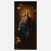 die Szene zeigt den von einem Heiligenschein bekrönten auferstandenen Jesus Christus, mit zum Himmel erhobenem Blick als Weltenherrscher, das Kreuz in seiner linken Hand haltend und mit der Rechten auf einen Reichsapfel als Symbol der Weltherrschaft Jesu und der Dreieinigkeit Gottes zu seinen Füßen deutend, der von zwei Putti gehalten wird, links über dem Kopf Jesu erscheinen am Himmel zwei weitere Engel, gering pastose, barocke religiöse Genremalerei mit schönem Licht, Öl auf Leinwand und Leistenrahmen, 18. Jh., unsigniert, Craquelure, wachsdoubliert, alt restauriert, Risse in der Leinwand, restaurierungsbedürftig, ungerahmt, Maße ca. 180,5 x 9 cm.