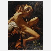 1602 schuf Michelangelo Merisi da Caravaggio (1571–1610) sein heute in den Kapitolinischen Museen in Rom verwahrtes Gemälde "Der Heilige Johannes der Täufer – Knabe mit Widder", das Gemälde war ein Auftragswerk für die Privatsammlung des römischen Marchese Ciriaco Mattei, der das Gemälde im Inventar seiner Sammlung und seinem Testament (1623) als "Giovanni Battista [Johannes der Täufer]" erwähnte und es nach seinem Tod dem Kardinal Francesco Maria Bourbon Del Monte (1549–1927), einem frühen Förderer Caravaggios vererbte, die provokante wie sinnliche Darstellung des Heiligen als nackten, geradezu erotisch wirkenden Straßenjungen, war seinerzeit ein Skandal und wurde wegen Verstoßes gegen das Decorum der Zeit von den Sittenwächtern abgelehnt, das nicht eindeutig auf biblischer Überlieferung beruhende Motiv irritierte, da die wesentlichsten Attribute des Johannes, bis auf Fellschurz und roten Mantel, fehlen, darüber hinaus wird Johannes sonst in Gegenwart eines Lammes, welches als "Agnus Dei [Lamm Gottes]" für Jesus steht, dargestellt, im vorliegenden Motiv lässt Caravaggio seinen Johannes einen unverkennbar ausgewachsenen männlichen Widder umarmen, das in trefflicher Hell-Dunkel-Malerei [Chiaroscuro] und bestechendem Naturalismus erfasste Gemälde mit seiner unkonventionellen, doch intensiven Bildsprache faszinierte ob seiner höchsten künstlerischen Qualität die Zeitgenossen und transportierte so unter dem Deckmantel eines Heiligengemäldes eine nahezu unverhohlene Homoerotik, welcher der Künstler und wohl auch der Auftraggeber selbst anhingen, feine, gering pastose Kopie, nahezu in Originalgröße, Öl auf Leinwand und Keilrahmen, links unten undeutlich signiert und datiert "2009", ungerahmt, Falzmaße ca. 131 x 97 cm.
